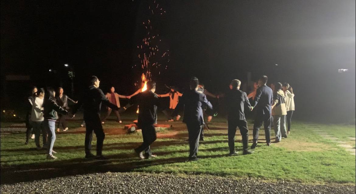 活动伊始,大家齐聚草坪,工会主席张爱娜老师点燃熊熊篝火,并宣布团建活动正式开始。随后,老师们分发烧烤工具、肉串及烧烤调料,老师们围在烤炉边一边体验着“自己动手丰衣足食”的乐趣,一边聊着工作和生活中遇到的各种趣事,空气中萦绕着欢乐的气氛,彼此的感情在美食中拉近。老师们卸下所有的烦恼和疲惫,围绕篝火载歌载舞,传递欢乐,尽情畅聊欢笑,其乐融融。