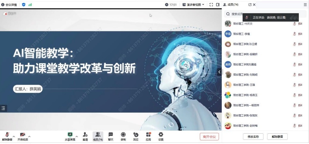5月14日晚上,太阳成集团tyc9728全体教师线上参加了由教育部电子信息基础课程虚拟教研室举办的题为“AI智能教学——助力课堂教学改革与创新”主题交流会。会议特邀中北大学副教授薛英娟作为报告主讲人,虚拟教研室负责人、北京邮电大学俎云霄教授主持交流会。