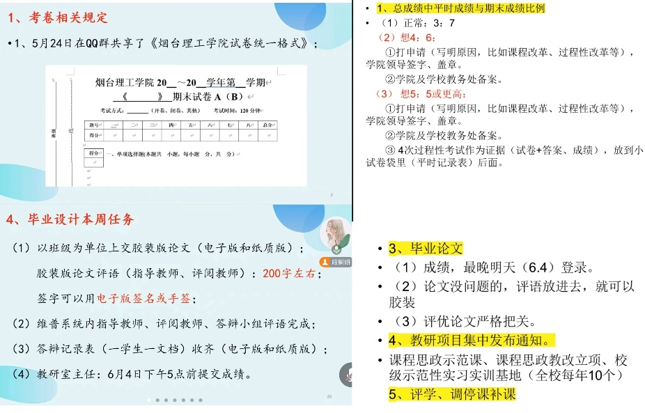 为全面迎接教育部本科合格评估,做好期末工作,6月3日晚上,公司线上召开了期末教学工作会议。会议内容主要围绕考卷管理、批阅规范、考试环节质量标准以及毕业设计的近期任务展开,旨在进一步提升公司产品质量,确保评估工作顺利进行。会议由经理助理段嗣妍主讲,常务副经理原帅主持,全体教师参加此次会议。