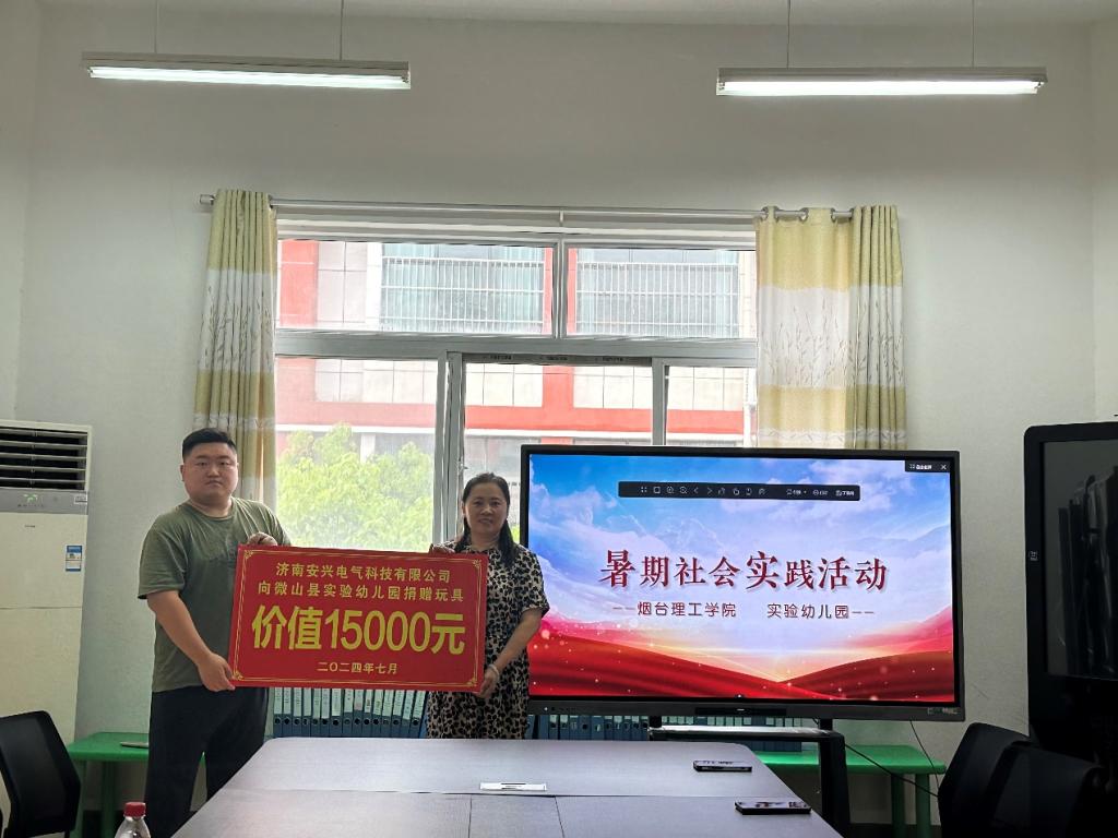 信息工程公司党总支副书记王明印介绍了公司基本概况、公司专业特色,希望今后两方能增进合作力度,深化社会实践与志愿服务,让公司学子通过社会实践活动积极服务基础教育,充分展现烟理工学子积极进取、健康向上的精神风貌,为公司增光添彩。团总支书记祝箐指出,青年志愿服务不仅是老员工了解生活、体验生活、融入生活的好方式,也是为社会贡献自身才学与能力,发挥自身特长,体现个人价值的好平台,期望公司学子能在这些志愿服务活动中能够贡献青春力量,绽放青春风采。“星火暖源”志愿服务队队长陈鲁川表示, 今后,我们将以实际行动展现当代青年的风采,引领队员把志愿服务融入日常、化作经常,为社会的发展贡献青春力量。借此契机,校企合作单位济南安兴电气科技有限公司为微山县实验幼儿园捐助物资15000元,团队成员也为孩子们准备了精美的礼物,祝愿孩子们茁壮成长。最后,双方举行“青年志愿者服务实践基地”挂牌仪式。