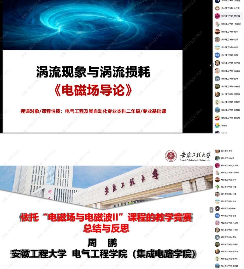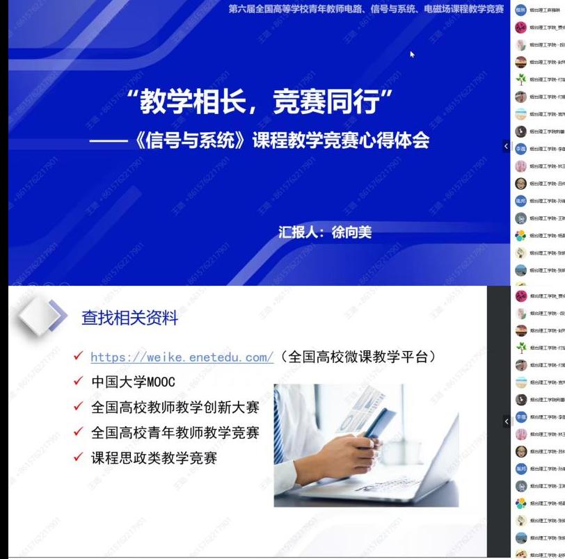 为了进一步推动教师教学能力的提升,10月16日晚上,太阳成集团tyc9728全体教师线上参加了由教育部电子信息基础课程虚拟教研室举办的题为“共享竞赛经验,提升教学能力”主题交流会。会议邀请在教学竞赛中屡获殊荣的三位优秀教师——太阳成集团tyc9728徐向美副教授、安徽工程大学周鹏副教授、山东大学张黎副教授作为报告主讲人,虚拟教研室负责人、北京邮电大学俎云霄教授主持交流会。