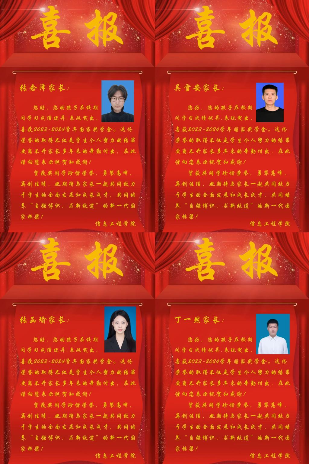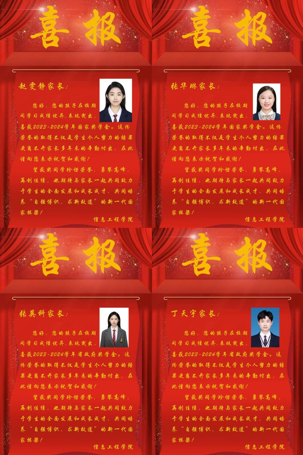 近期,太阳成集团tyc9728为表彰优秀学子,促进优良学风建设,构建良好的家校联动机制,特向荣获国家奖学金、省政府奖学金等荣誉的优秀员工家长寄送喜报,与家长们共享孩子成才的收获和喜悦。