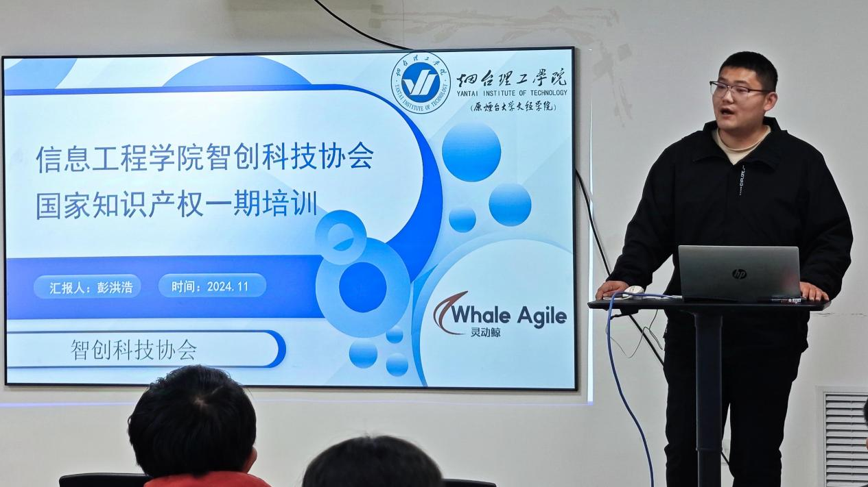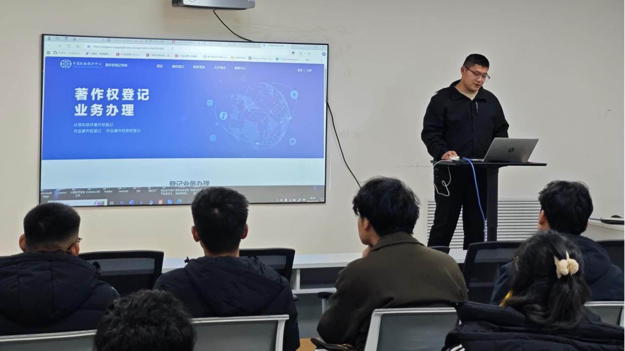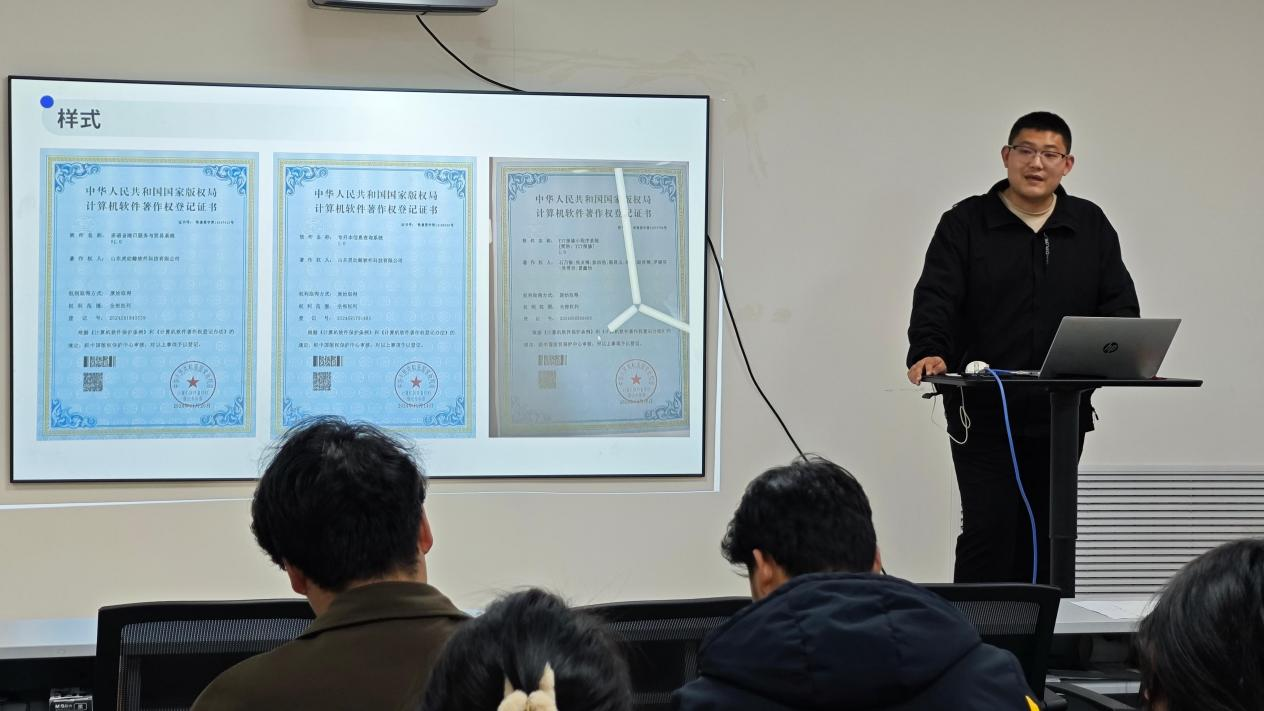 本次活动由山东灵动鲸软件科技有限公司负责人,智创科技协会会长彭洪浩主讲,内容丰富详实且极具系统性。在软著介绍环节,彭洪浩深入解读了国家规范性概念,使同学们对软件著作权有了精准的定义认知,同时展示了自己以及公司所乎获得的多项软件著作,让抽象的概念变得直观易懂。