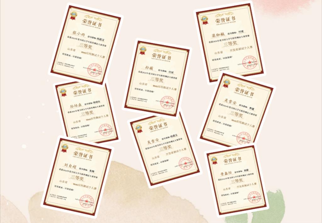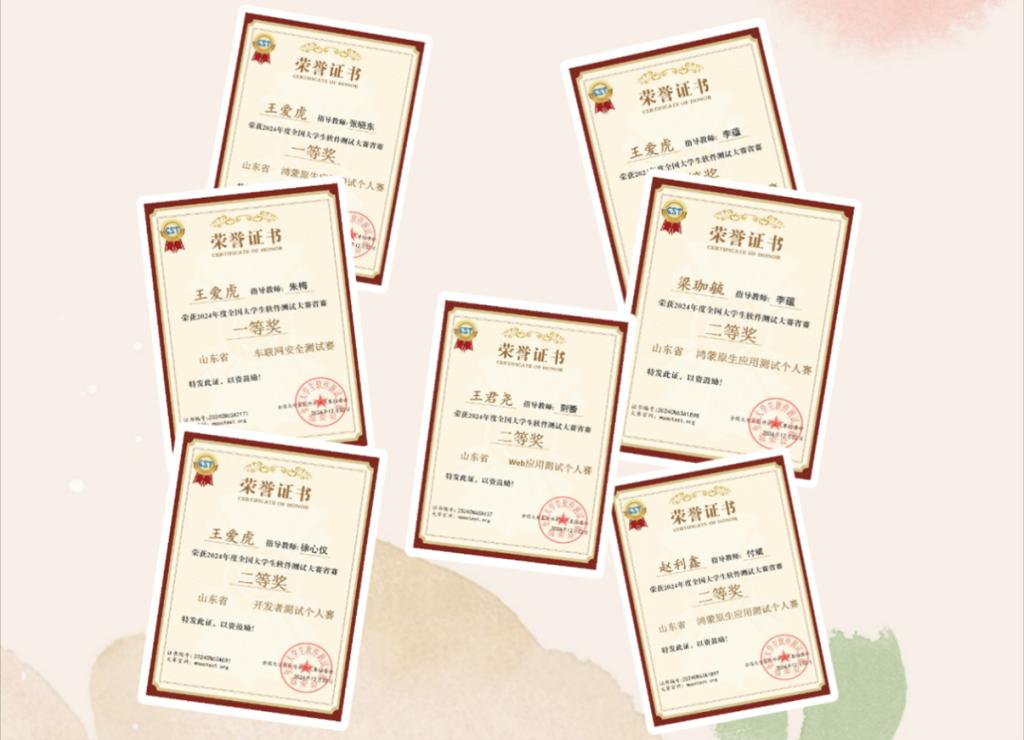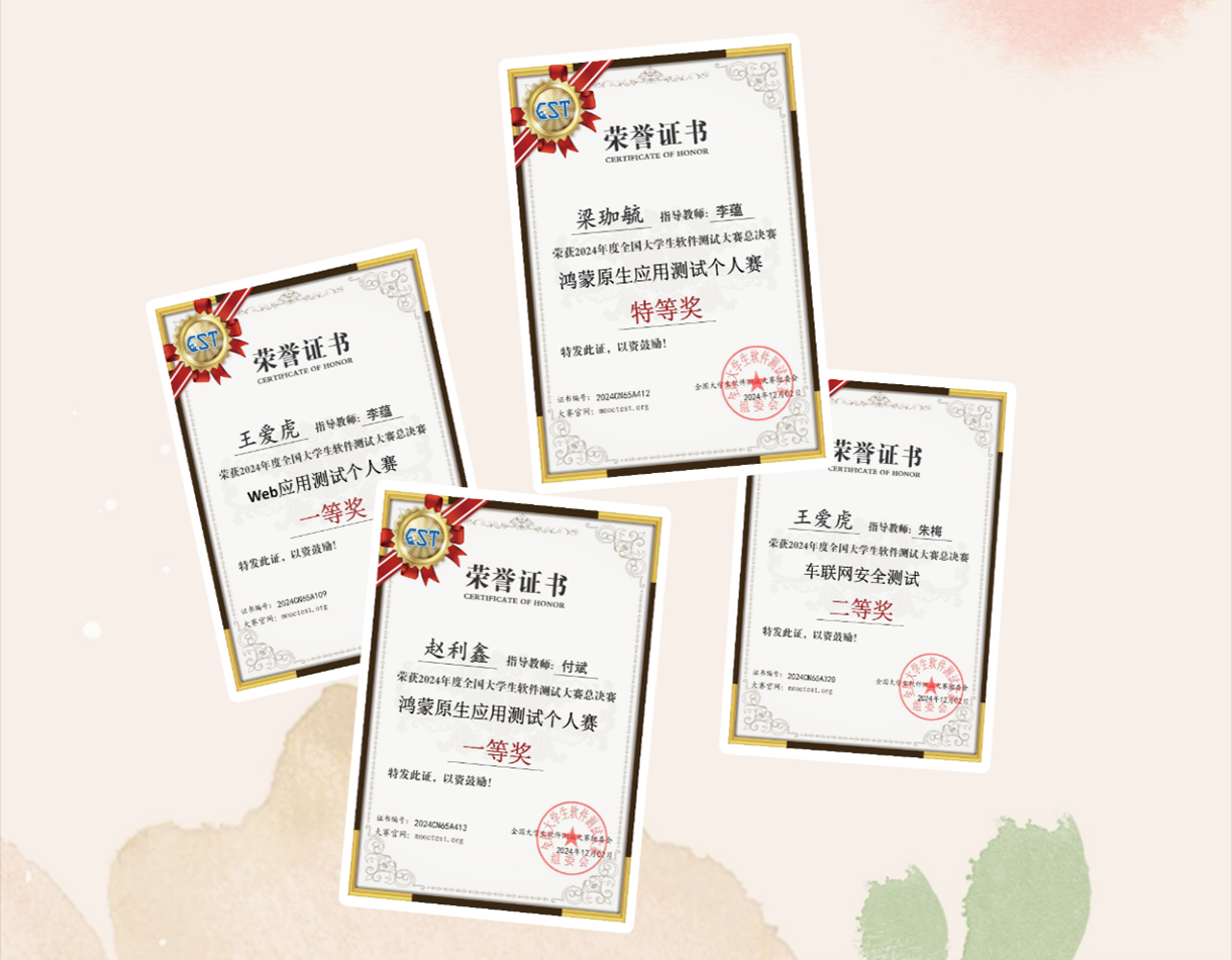 省赛于2024年10月26-27日在青岛科技大学举行,公司学子参加了“拓思杯”开发者测试大赛、“慕测杯”Web应用测试大赛、“控安杯”车联网安全测试大赛和“华为杯”鸿蒙原生应用测试大赛四项比赛,获得省赛一等奖3项、省赛二等奖4项、省赛三等奖8项、省赛优胜奖7项。王爱虎、梁珈毓和赵利鑫三位同学入围了全国总决赛的6项赛事,其中王爱虎同学一人入围4项全国总决赛资格,是公司软件工程专业首位获得该赛事4项入围全国总决赛资格的优秀学子。