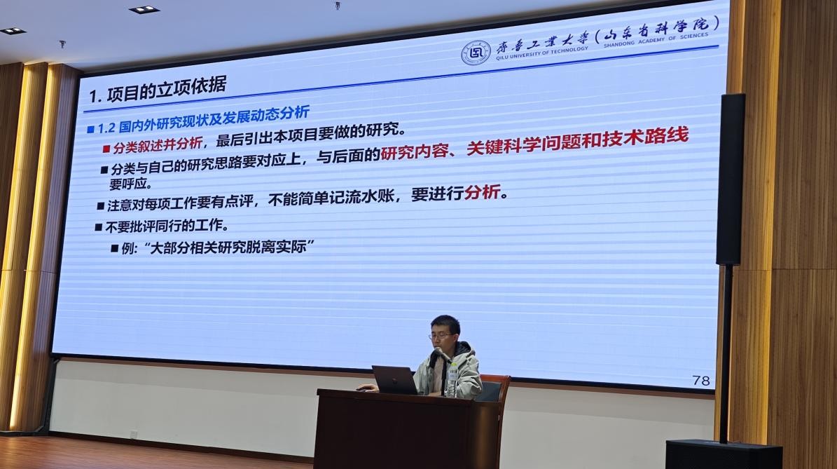 汇报后半段,王教授转向科研项目申报指导,介绍国家自然科学基金与山东省科技计划项目的资助格局与申报方向,结合实例拆解项目申请书撰写要点。从选题策略的精准定位、代码与关键词的科学选择,到题目拟定的简洁性、摘要撰写的核心提炼,再到正文提纲的逻辑设计、研究基础与工作条件的充分说明,均逐一细化讲解;同时针对撰写过程中的常见问题(如逻辑断层、细节疏漏等)强调注意事项,为教师规避申报风险提供具体建议。